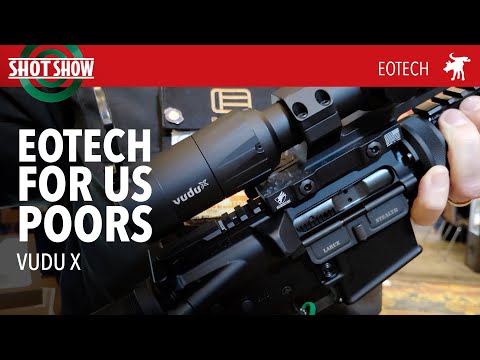 EOTech introduced the Vudu X line at SHOT Show 2024, targeting recreational shooters, 3-Gun competitors, and hunters. The line includes a 1-6x24 second focal plane scope with a 30mm tube, priced at $799 and shipping in April/May. A 2-12x40 multi-purpose optic with parallax adjustment and a throw lever is also available for $849, featuring illuminated reticles with ballistic holds.