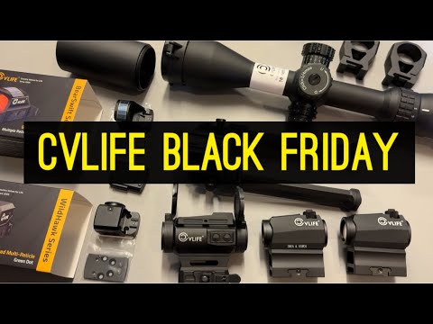 This video highlights several CV Life Black Friday deals on tactical optics and accessories. It features a CV Life Eagle Blaze 5-25x50mm scope, an MLOCK bipod, a 25mm multi-reticle red dot, the Bear Swift RMSC/RMR/MOS optic, the Jack Ohio 2 MOA red dot, a multi-reticle red dot with 3 MOA dot and 65 MOA circle, and the Wild Hawk enclosed auto-brightness red/green dot sight. The presenter emphasizes the value and performance of these products at discounted prices.
