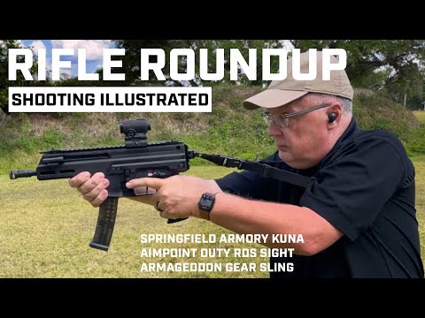 This video reviews the Springfield Armory Kuna, a 9mm large format pistol featuring a modified blowback action, ambidextrous controls, and a 6-inch barrel. It highlights the pistol's M-LOK handguard, hybrid iron sights, and proprietary magazine system. The review also covers the Aimpoint Duty RDS optic, emphasizing its durability and 3-year battery life, and an Armageddon Gear single-point sling.