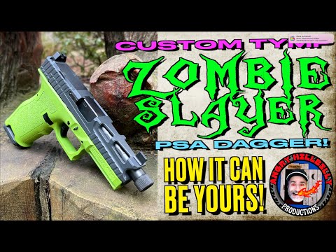 The Yankee Marshal details the assembly of a custom PSA Dagger pistol, built through viewer votes. Key components include a zombie green lower, a gray SW5-style slide, a black threaded honeycomb barrel, and Magpul 17-round magazines. The firearm is being given away to a Subscribe Star member, with entry tiers based on membership level.