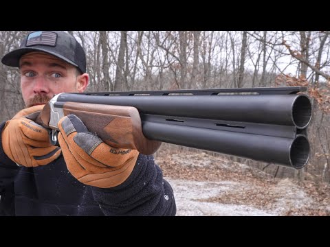 This video features the Stevens 555 Sawed-Off Double Barrel 12 Gauge Shotgun. The description highlights affiliate links for ear protection, merchandise, and Patreon support. It also lists the creator's camera gear, including their main camera, lenses, slow-motion camera, vlog camera, microphone, and GoPro. The focus is on showcasing and potentially reviewing this specific firearm.